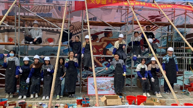 此次助力“百千万工程”墙绘活动学院党委高度重视,院领导、学工办老师也来到现场给予了宝贵的指导和建议。在天冷时老师们还给我们购买热气腾腾的糖水,关心我们的身体状况。许志强老师更是自始至终陪伴在我们身边,全程指导并参与组织实施。为了更好更出色地完成这幅作品,许老师还邀请了一位专业从事美术工作的校外指导老师,为龙舟上的人物和醒狮增添了生动的色彩。