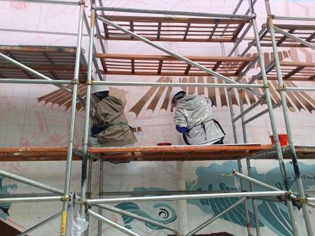 上午,所有墙面的勾线工作圆满完成。下午,我们开始调色并上色。在许志强老师的指导下,墙面上色工作正式启动,主要内容为绘制波浪与跑道图案,为整个墙绘作品奠定了基调。