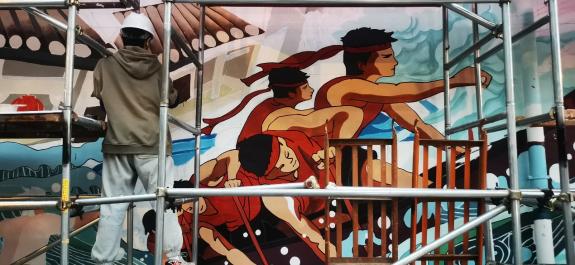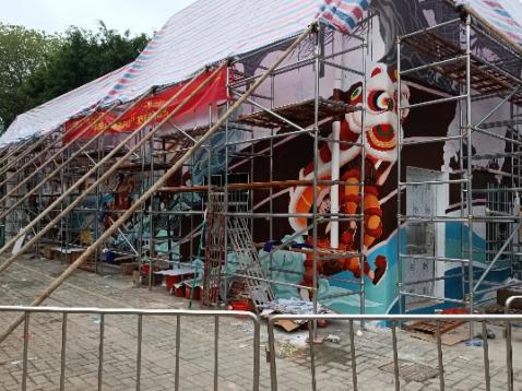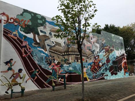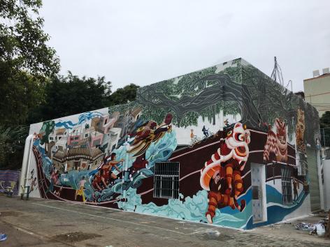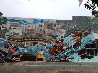 在接下来的几天里,我们继续上色工作,先完成大的主体部分,如人物、龙舟、房子、醒狮、大树等图案,然后逐渐深入到更细致的部分,使整幅墙绘作品逐渐丰满起来。