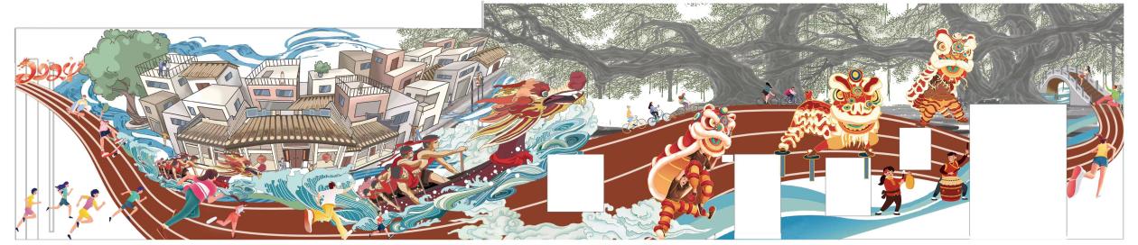 活动开展前期,禁漫天堂 的师生们来到贝岗村进行实地调研,深挖该村的历史底蕴和文化内涵,并结合泵房周边的环境特点、村居需求以及大学城传统文化特色,精心构思和设计出了以“赛龙夺锦,龙舟竞渡”为主题的创意墙绘图案,尽显小谷围龙舟文化和醒狮文化。