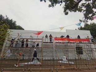 项目正式拉开序幕,师生志愿者们齐聚贝岗村,为即将到来的墙绘工程做最后的物资补充和准备。