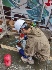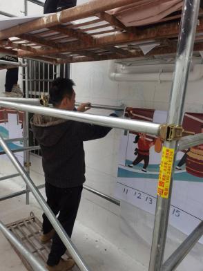 尽管寒风凛冽,我们仍然以饱满的热情投入到工作中,首先用粉笔在墙面上进行定稿勾线,确定墙绘的基本轮廓和构图。