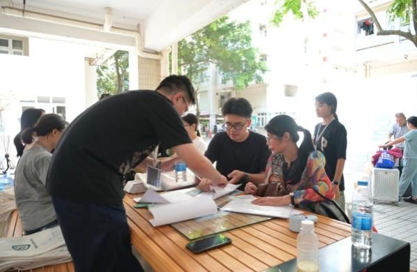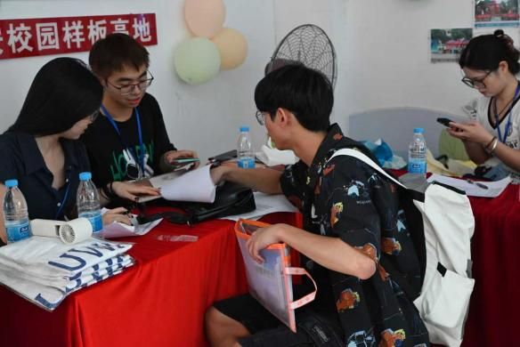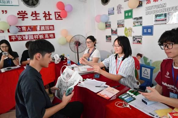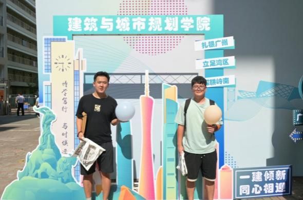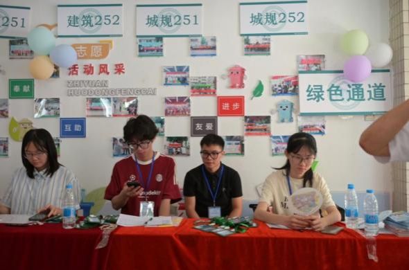 在建院迎新的大本营里,领导老师们整理着装有新生手册的资料袋,学长学姐举着欢迎牌张望,等待着新生的到来。