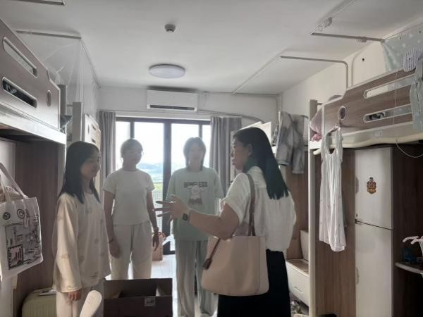 迎新现场,校党委书记、学生处黄志凯处长和学院院长李建军老师慰问了在场的工作人员,确保迎新工作有序进行。随后,学工办主任苏展勇老师带领班主任老师一同走访宿舍。同时,院团委书记林舒莹老师和辅导员陈楚月老师则前往国际班和研究生宿舍慰问学生。