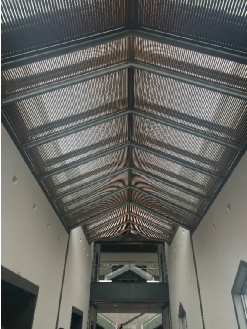 下午1:30,我们与邓小飞老师一起调研苏州博物馆。建筑通过灰色的金属构件将白色实墙划分开来,白色墙体与玻璃窗户带来虚实分明的观景体验,既有强烈的现代感,又富有苏州传统建筑的韵味。主展厅内使用正方形玻璃,运用框景手法将引入室外竹林的景色,为展厅内部投入青绿色的素雅韵的氛围。主展厅外是一对钢制的平行双分楼梯,以玻璃作为栏板,加以条状的不锈钢扶手,并与楼梯后的一面水墙共同构成一处重要的节点空间,风格简洁现代。与楼梯相对的是一处走廊,其设计也别出心裁,运用不同形状的漏窗进行框景,活跃走道的气氛,同时顶部的木制格栅起到柔化阳光、形成丰富光影的效果。