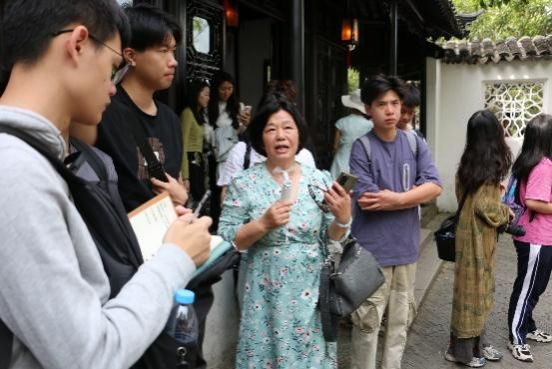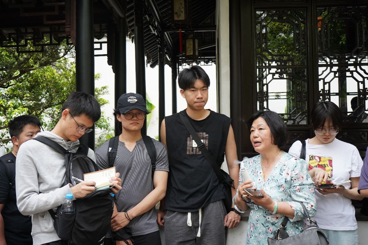 入园后,汹涌的人潮便令同学们愕然驻足,邓老师随即指出拙政园原为文人雅居的私密空间,其精巧的尺度与曲折的游线设计,在面对现代大众旅游时则显露出局限性,导致了现如今大批人流涌入园林中水泄不通的情况。随着讲解的深入,拙政园"天人合一"的营造哲思渐次展开,从"荷风四面亭"的临水构筑到"见山楼"的错落形制,各类建筑与山石水系通过"借景""对景"等手法形成有机整体。同时,邓老师提到在拙政园的营造体系中,水体、假山与建筑绝非孤立存在,而是通过三种精妙手法达成"形神相融"的境界。真正的造园艺术,从不是元素的简单叠加,而是让自然与人工在相互成全中抵达诗意巅峰。