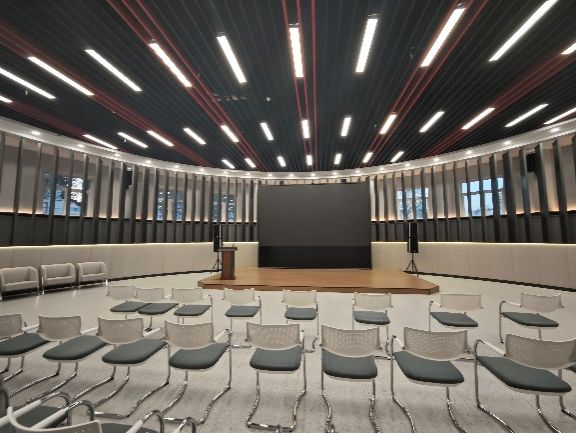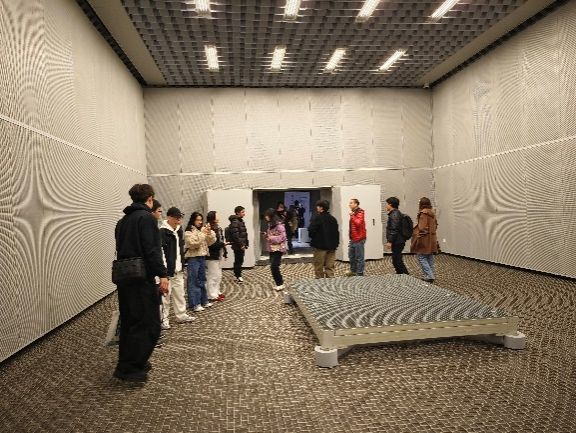 早上11:00,访学团前往位于哈尔滨工业大学二校区的寒地建筑科学与工程研究中心参观哈工大建院的实验室。在哈工大建筑与设计学院专任教师唐朝的带领下,访学团的成员首先参观了机器人智慧建造实验室,感受到了前沿科技在建筑行业应用方面的巨大潜力。随后,我们又走进了建筑声学实验室,包括隔声室、全消声室和混响室,深入了解了声音在建筑空间中的传播与控制原理,这些实验室为建院的师生提供了一个绝佳的学习与探索平台。