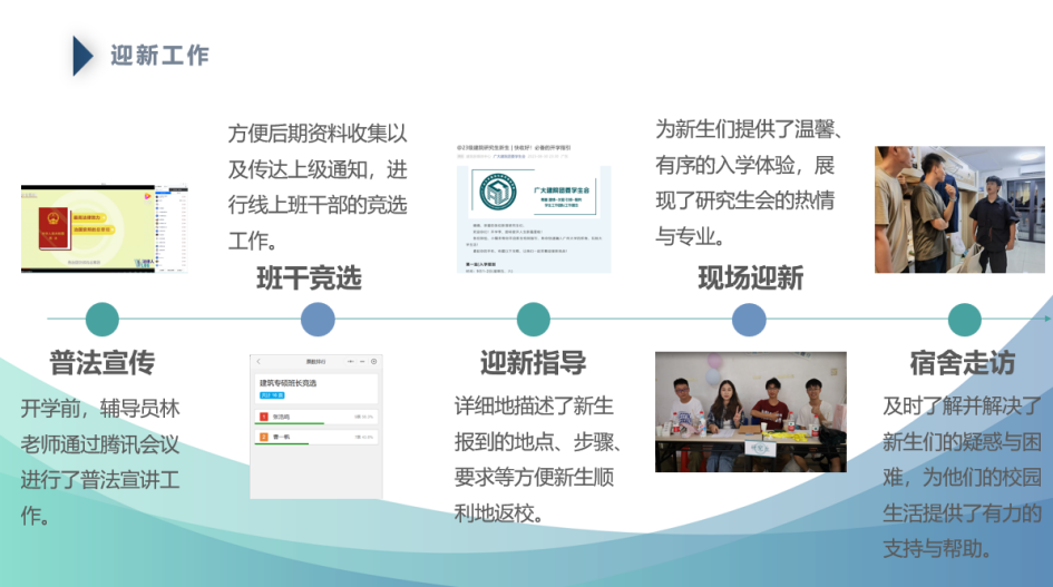 在新生开学之际,研究生会协助学院对新生进行普法教育,组织线上班干部竞选,并提供迎新指导和现场接待;通过宿舍走访了解新生需求,帮助他们适应校园生活;招募新成员,为组织注入新活力。