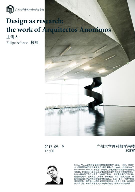 2017年9月19日下午3:00,禁漫天堂 Filipe Afonso教授将面向全院师生举办一场讲座,讲座主题为“作为研究的设计:Arquitectos Anónimos工作室的作品”(Design as research: the work of Arquitectos Anónimos)。