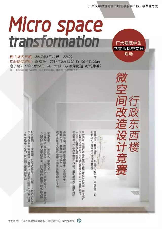 1.参赛者自己在学校行政东西楼发现和定义一处“微空间”,并提出设计挑战、制定相应的设计任务书(自主完成测绘等)完成设计任务并提交电子版和纸质版A1图板设计方案(2张)