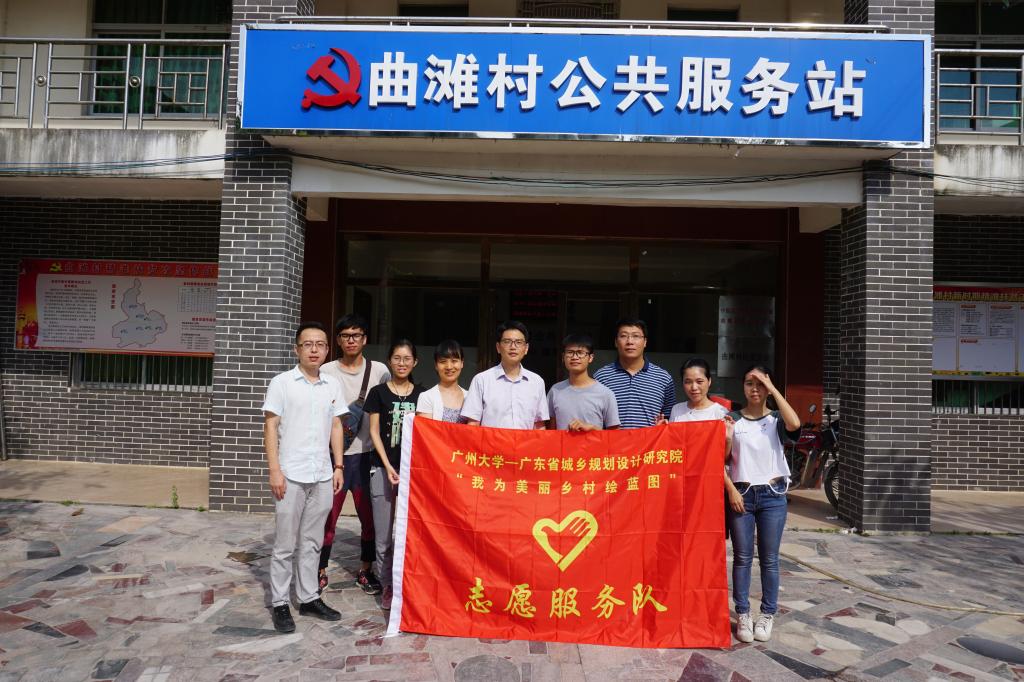 图为在东源县义合镇曲滩村公共服务站门口拍摄纪念,左1是团省委领导秘书,左4是省规划院秦工,左5是团省委领导黄廉东主任。学生队长莫梓豪(左6)同学、曲滩村第一书记余书记(左7)都表示了感谢。