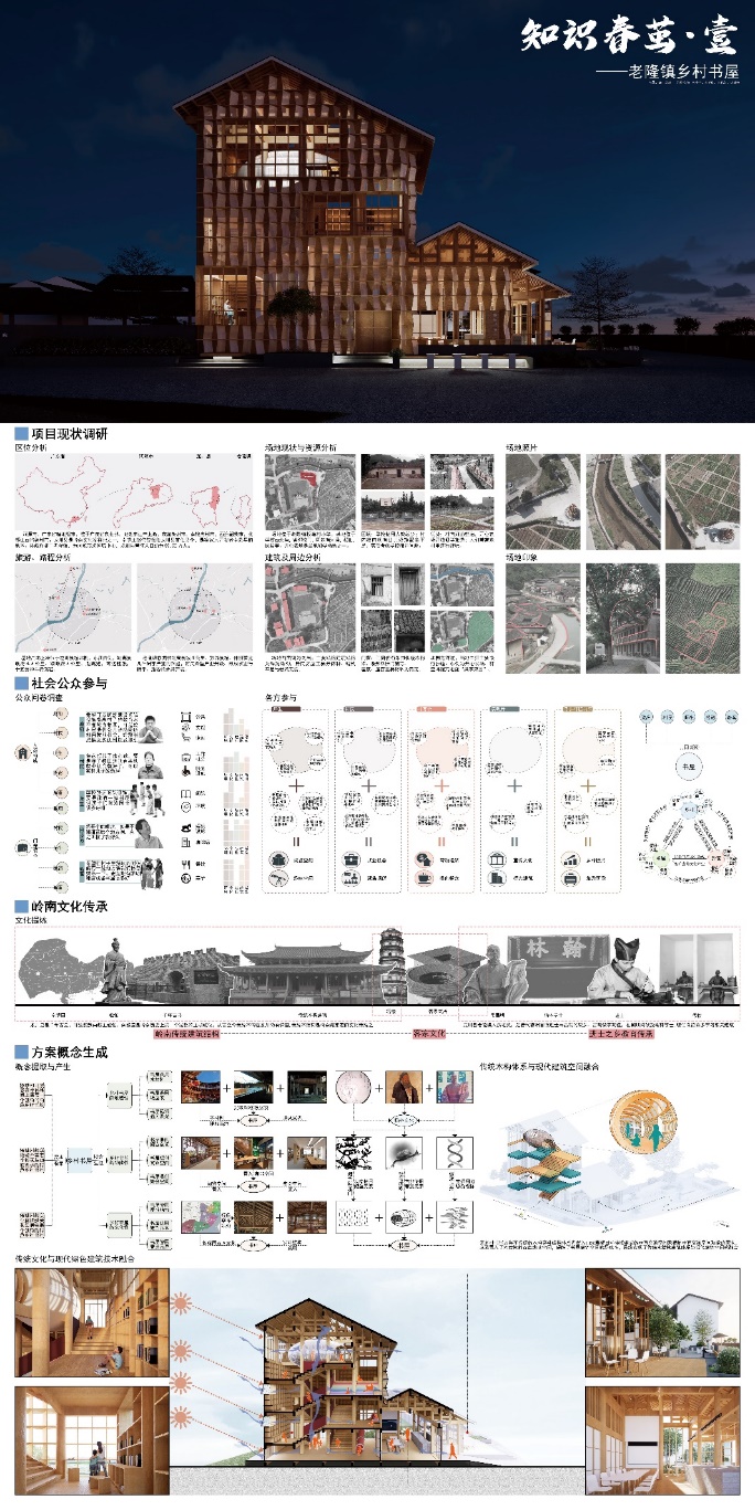 说明:项目位于河源市龙川县老隆镇板塘村一学校,目前该校在校学生较少,基础设施较差,同时板塘村的乡村产业发展也受到了限制。在为学校提供图书阅读教育,为村民提供日常阅读公共服务的同时,也能把乡村进行产业升级,使之可以提供研学以及旅游服务。书屋的建筑功能主要为当地学生和当地村民提供图书阅览服务,给外来研学旅游的人们提供阅览、咖啡以及旅游接待服务。建筑的建设面积587平方米,总建筑面积263平方米。整个书屋建筑采用传统木结构,榫卯搭接方法。书屋内部采用了双螺旋的结构来创造更多的空间体验,更适合学生进行阅览。在外部形体上,书屋整体材质为木材质,表皮采用了模数化“鳞片”表皮,配合太阳光线在室内形成优美的光影效果,引用了当地民居传统青瓦坡屋顶以及干阑式架空的概念;在内部空间上在保证了高效的使用面积的前提下引入了“双螺旋动线”的概念,即在传统的木构房屋中嵌入了一个双螺旋楼梯。这个楼梯的目的地就是茧壳,在孩子们向上攀登汲取知识的过程中,使其逐渐发现潜能,孵化理想。