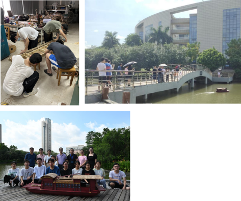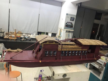 学院把课程思政融入到实践教学中,创设“做模型、学精神、悟思想”的教学模式,以南湖“红船”作为模型教学的载体,把专业教学与思政教育有机结合起来。模型制作之初,同学们是一边查阅史料、听着红船故事,一边熟悉图纸和材料工具,不断丰富制作的经验和提升制作的能力水平。在学院林卫新老师的指导下,同学们克服困难,同心协力,努力掌握各种木工工具的使用技能,用心地学习激光打印技术以及榫卯连接方法,最终以1:10的比例制作“红船”模型(总长为2.18米,高宽分别为0.5米),耗时两个多月完成。在制作过程中,同学们深刻体会到只有对细节做到一丝不苟、精益求精,才能成功实现初定的目标;也加深对党史知识的学习、对“红船精神”的感悟,在克服困难中磨炼了意志、得到了成长。