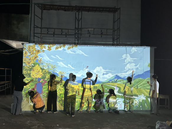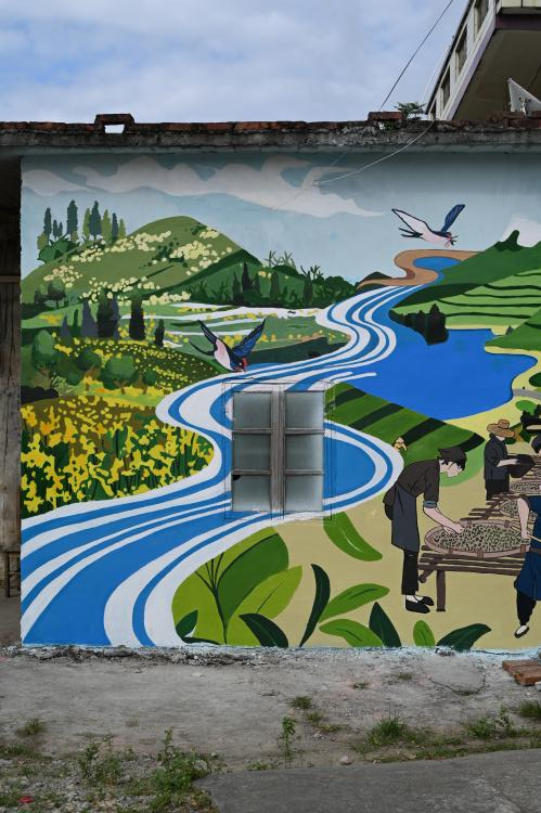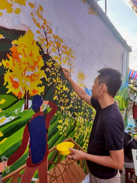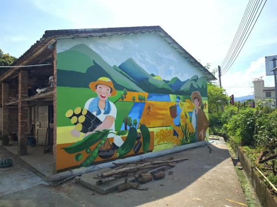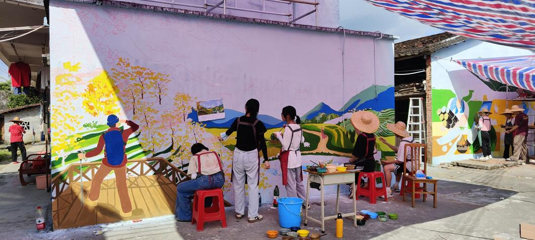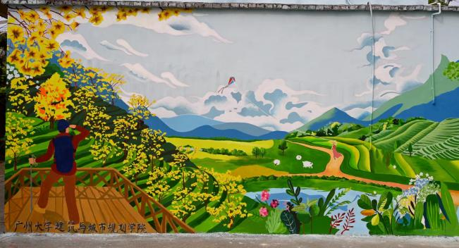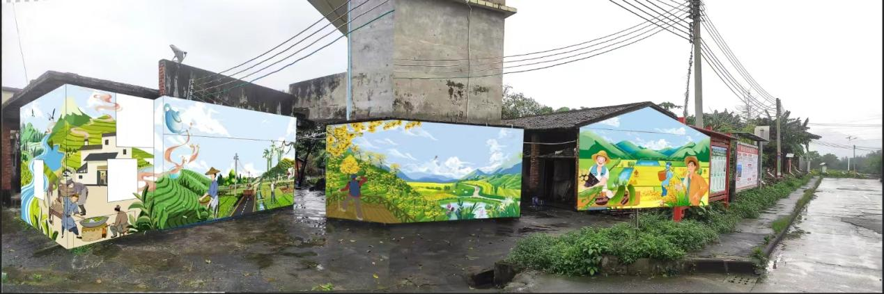 今年初,学校初步确定学院党委与锦田村党总支结对开展党建共建,1月份,学院组织师生一行三十余人来到英德调研测绘,村总支向学院提出墙绘需求。根据当地所需,发挥高校所能实践团随即进行深入调研、现场测量,志愿者们“因地制宜”结合锦田村茶园、各类蔬菜、黄花风铃等极具特色的本地符号,创新性设计完成了贴合锦田村村庄特色的墙绘主题方案,并在7月6日-10日来到锦田村,共同完成了近100平方米的现场主题墙绘。