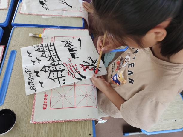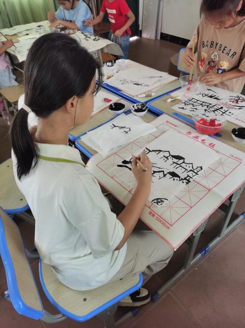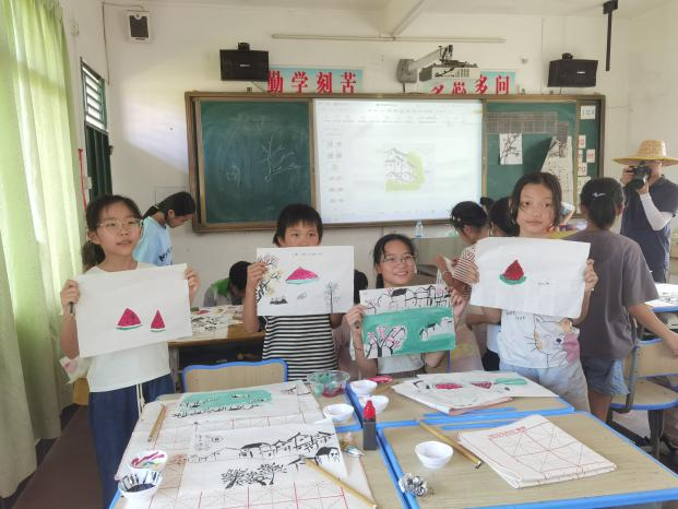 墙绘活动期间,建筑学院向阳团队为锦田村小学的学生开设了2天的特色建筑美术义教课程。结合专业特色向小朋友们开设建筑认知课、速写课和国画基础知识课,充分发挥专业优势,增强美育教育,从小培养孩子们对美的发现力、感知力、创造力。课程主要以理论和实践相结合的方式展开,课堂上学生们积极发言、踊跃提问,气氛活跃,教学过程认真学习,用心绘画,通过师生互动交流,感受到孩子们对艺术的热爱与追求,真正以美育人,以美化人。