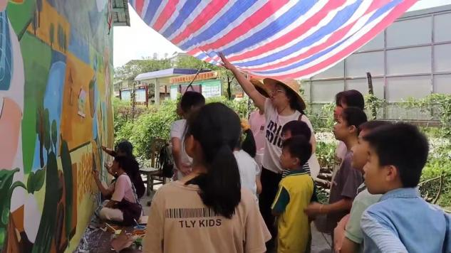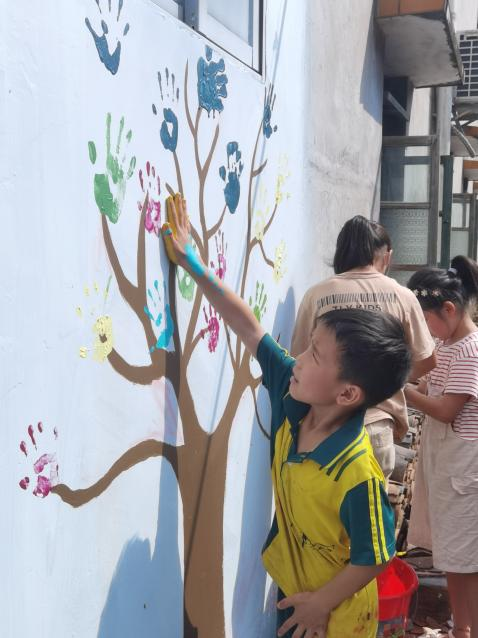 除了课堂内的互动,小老师们也就地取材,带着小朋友参与到墙绘的创作中,小老师耐心教导小朋友墙绘知识,传播墙面背后的故事,还共同绘制了生动多彩的手掌树。互动过程中,大家都对活动产生了浓厚的兴趣,呈现出积极为美化家乡贡献自己力量的精神面貌,这也让绘画的小老师更加投入其中。