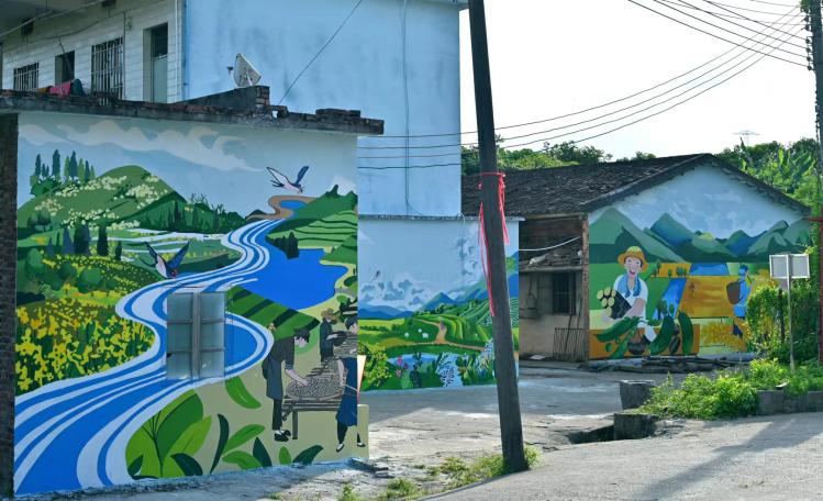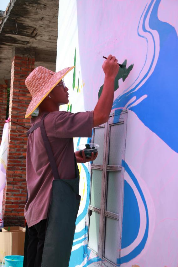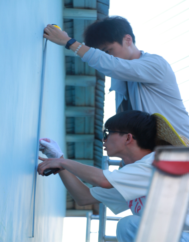 凝聚青春活力,绘就美丽乡村。在现场墙绘过程中,师生配合默契,反应迅速,现场搭建架子、清理场地,集体调制颜料、绘制线稿,面对单调的淡蓝墙面,志愿者们鼓足干劲,起笔上色丝毫不差,画笔在光影间条约,色彩在白墙上浮现。志愿者们每天起早贪黑,时刻精益求精,即使脚踏热浪,挥汗如雨,也不惧骄阳、不辞辛苦,用手中画笔生动地描绘出一幅幅美丽的乡村画卷。