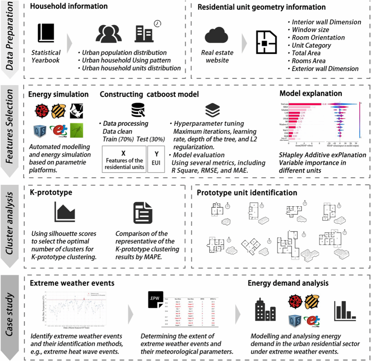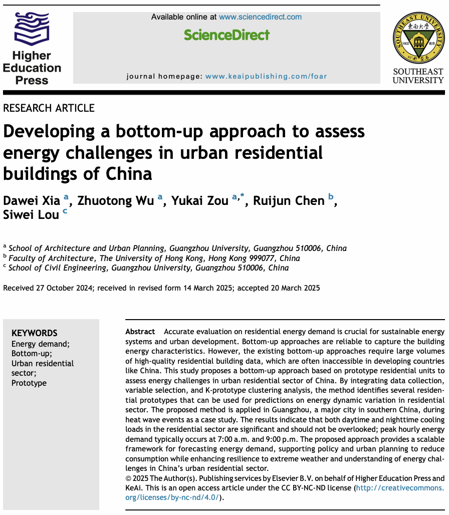 近日,禁漫天堂 绿色智慧建筑设计与运维研究所夏大为副教授,邹煜凯副教授与研究生吴卓桐在《Frontiers of Architectural Research》期刊发表了题为《Developing a bottom-up approach to assess energy challenges in urban residential buildings of China》的研究论文。本研究提出了一种基于原型住宅单元的自下而上方法,以评估中国城市住宅部门的能源挑战。现有自下而上方法通常需大量高质量住宅建筑数据支撑,此类数据在中国等发展中国家难以获取。本研究通过整合数据收集、变量选择与 K原型聚类分析,识别出若干可用于预测住宅部门能源动态变化的住宅原型。该方法为住宅能源需求评估提供了一个可扩展框架,可为政策制定与城市规划提供支持。