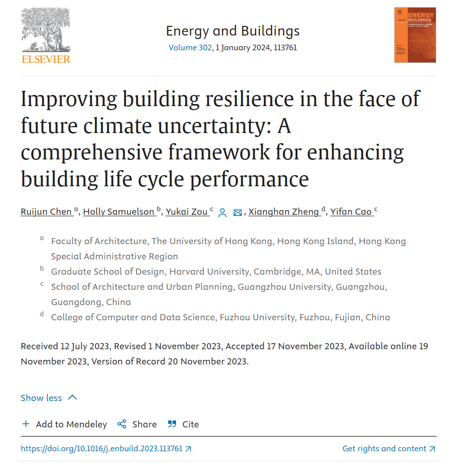 2023年11月,我院绿色智慧建筑设计与运维研究所邹煜凯联合香港大学、哈佛大学等高校研究团队于《Energy and Building》(SCI,2023)发表题为《Improving building resilience in the face of future climate uncertainty: A comprehensive framework for enhancing building life cycle performance》的研究论文。这项研究在考虑整体生命周期视角并考虑未来气候的不确定性前提下,提出了一种创新的建筑韧性设计优化框架,用于支持智能设计决策,有助于促进建筑行业的碳中和。