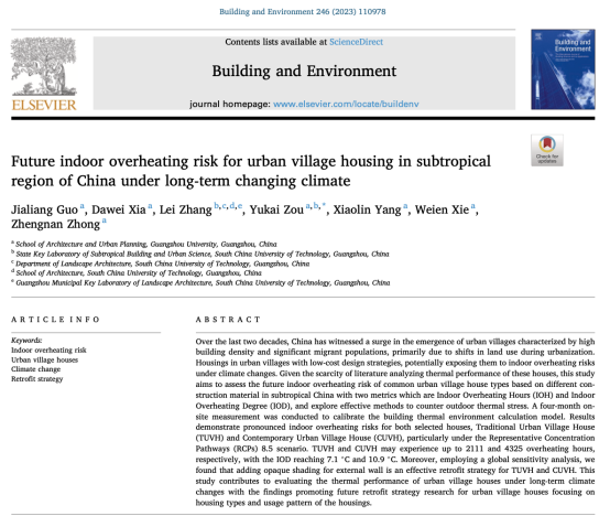 2023年10月,我院绿色智慧建筑设计与运维研究所夏大为、邹煜凯、杨晓琳老师指导硕士研究生郭嘉良、谢维恩、钟正楠于《Building and Environment》(中科院一区,SCI,2023)发表题为《Future indoor overheating risk for urban village housing in subtropical region of China under long-term changing climate》的研究论文。该研究主要评估中国湿热地区城中村住房基于未来气候变化下的室内过热风险,以及讨论当前其低成本改造策略在未来气候条件下降低过热情况的可能性。研究结果为评估亚热带地区高密度低成本住房未来室内热环境评估研究提供参考价值。