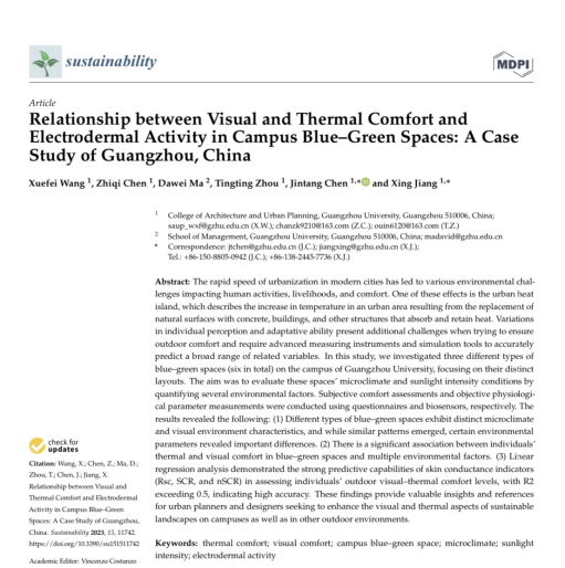 2023年8月,我院城乡高质量发展协同创新中心王雪霏老师于《Sustainability》(SSCI, 2023)发表了题为《Relationship between Visual and Thermal Comfort and Electrodermal Activity in Campus Blue-Green Spaces: A Case Study of Guangzhou, China》的研究论文。这项研究的主要目的是探讨皮肤电导指标是否可用于预测室外视觉热舒适度。研究结果表明,不同类型的蓝绿色空间在微气候和视觉环境方面呈现出不同的特征,与个体的热和视觉舒适度有多种环境因素相关。同时,皮肤电导指标在评估户外视觉热舒适度方面展现出强大的预测潜力。这项研究为未来的室外视觉-热舒适性评估提供了重要的指导,特别是考虑到人体生理参数的因素。