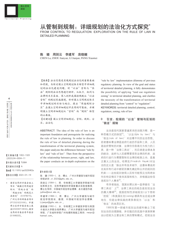 2023年4月,我院城乡高质量发展协同创新中心 陈璐 老师于《城市规划》 (CSSCI/北大核心)发表题为《从管制到规制:详细规划的法治化方式探究》的研究论文。该研究为探讨国土空间规划体系转型中详细规划的法治化建设问题,对“以法”管制与“依法”规制的法治思想进行辨析,从权力、权利与法律的关系层面,深入剖析我国控规既往“以法管制”的规划实施困境。针对国土空间规划体系中详细规划的目标与地位,提出“用途规制分区”在国土空间详细规划中应用的可能性,并阐明国土空间详细规划从“管制”向“规制”转型的必要性。