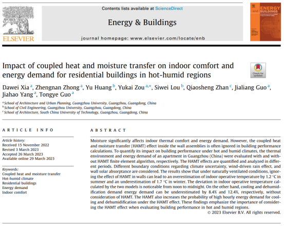 2023年4月,我院 绿色智慧建筑设计与运维研究所 夏大为、邹煜凯老师指导硕士研究生钟正楠、郭嘉良、杨嘉豪、郭曈烨于《Energy and Buildings》 (SCI,2023)发表题为《Impact of coupled heat and moisture transfer on indoor comfort and energy demand for residential buildings in hot-humid regions》的研究论文。该研究分析了不同边界条件下围护结构中的热湿耦合传递效应(HAMT)对湿热气候地区居住建筑的室内舒适度与能耗的影响。研究结果对该地区居住建筑室内舒适度评价以及建筑节能提供指导作用。