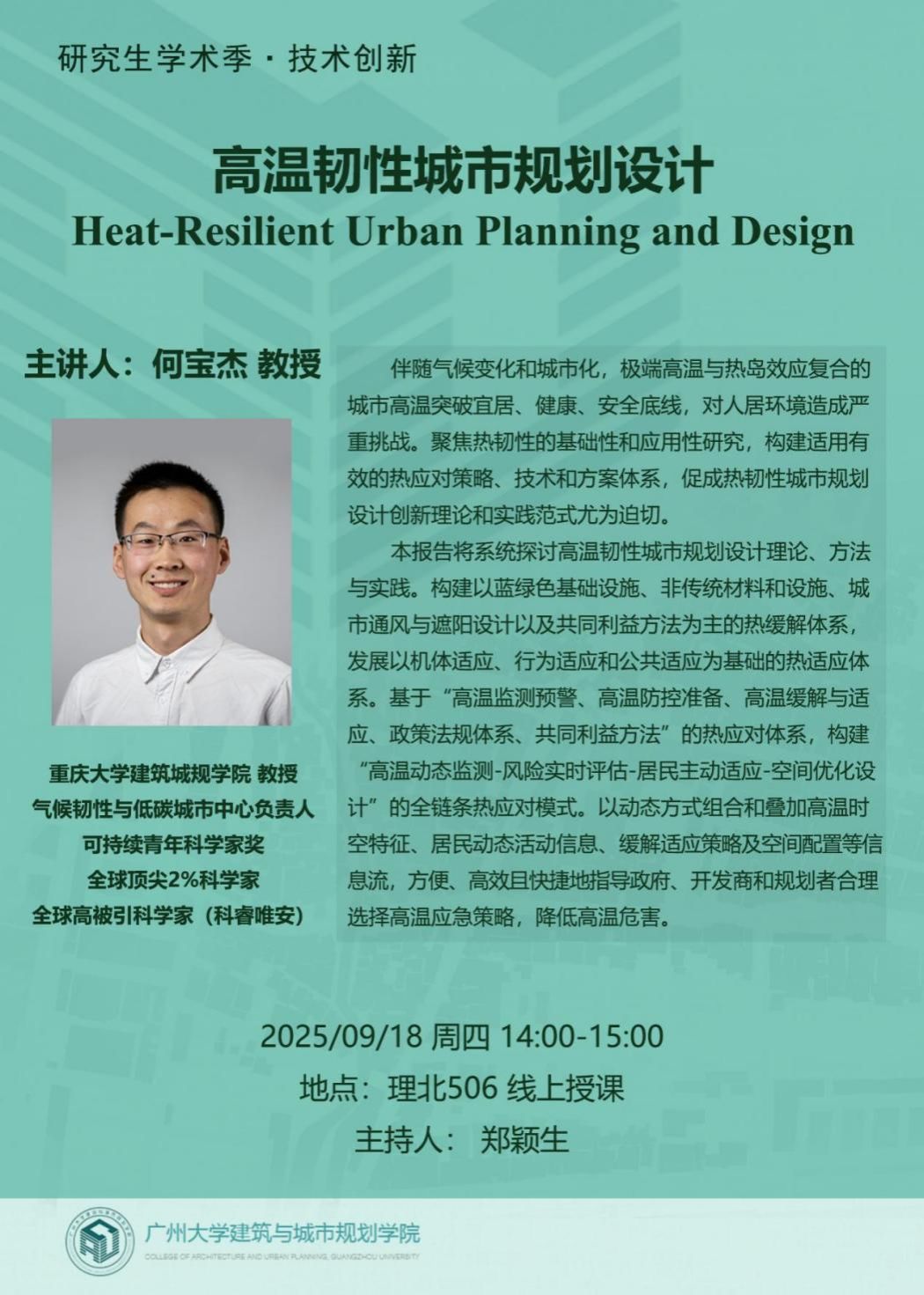 主讲人 | 何宝杰(重庆大学建筑城规学院教授、博导、巴渝学者,气候韧性与低碳城市中心负责人,澳大利亚昆士兰大学客座副教授,日本广岛大学荣誉研究员,2022-2024 年蝉联全球高被引科学家(科睿唯安),2023-2024 年连续获评中国高被引学者,全球顶尖2%科学家);
