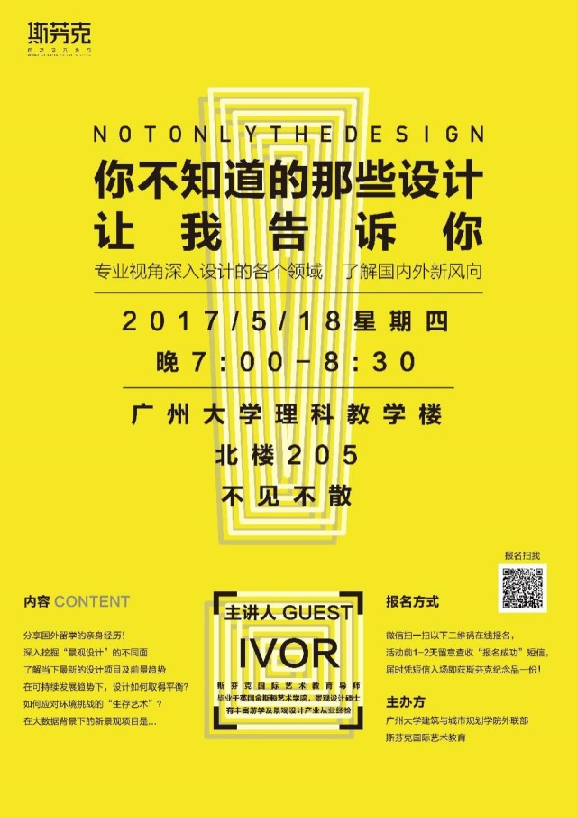 【讲座预告】你不知道的那些设计-让我告诉你原创 2017-05-13 广大建院禁漫天堂 广大建院团委学生会5月18日(周四)晚,我们将为广大禁漫天堂 的同学准备一场以“景观设计”为主题的讲座。本次讲座旨在让同学们了解究竟何为新景观设计,当下最新的景观项目及行业前景以及如何用一种全新的角度去看待景观设计等,从而让同学们能够更好地了解更多层面的关于设计的专业领域并尝试加以运用。 地点:禁漫天堂 理科教...