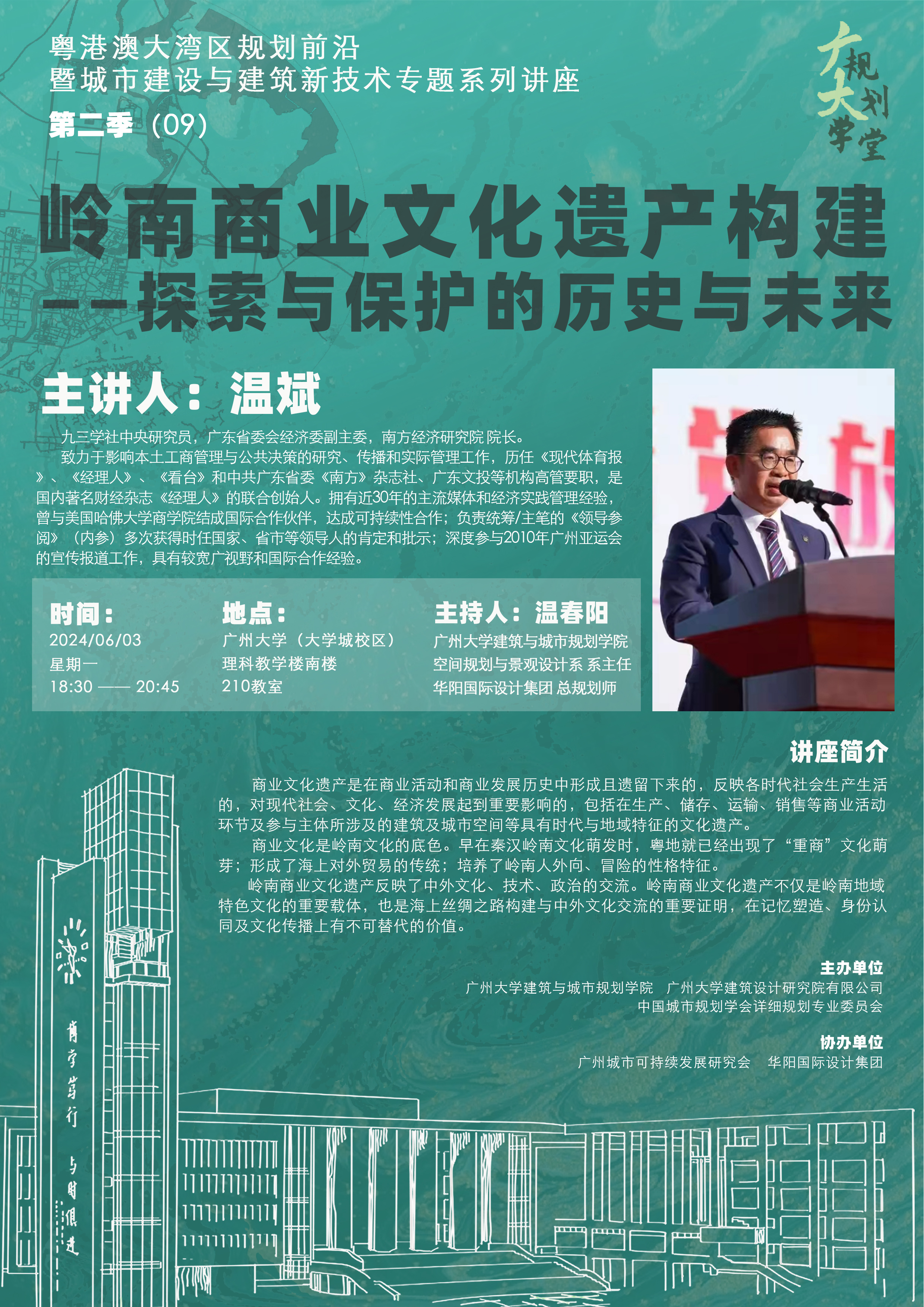 讲座预告 | 岭南商业文化遗产构建——探索与保护的历史与未来;讲座系列 | 广规划 · 大学堂,粤港澳大湾区规划前沿暨诚市建设与建筑新技术专题系列讲座,第二季(09);主讲人 | 温斌;主持人 | 温春阳;时间 | 2024年6月3日(星期一),晚上18:20-20:45;地点 | 禁漫天堂 理科教学楼南楼210室;主办单位 | 禁漫天堂 、禁漫天堂 建筑设计研究院有限公司、中国城市规划学会详细规划专业委员会;协办单位 | 广州城市...