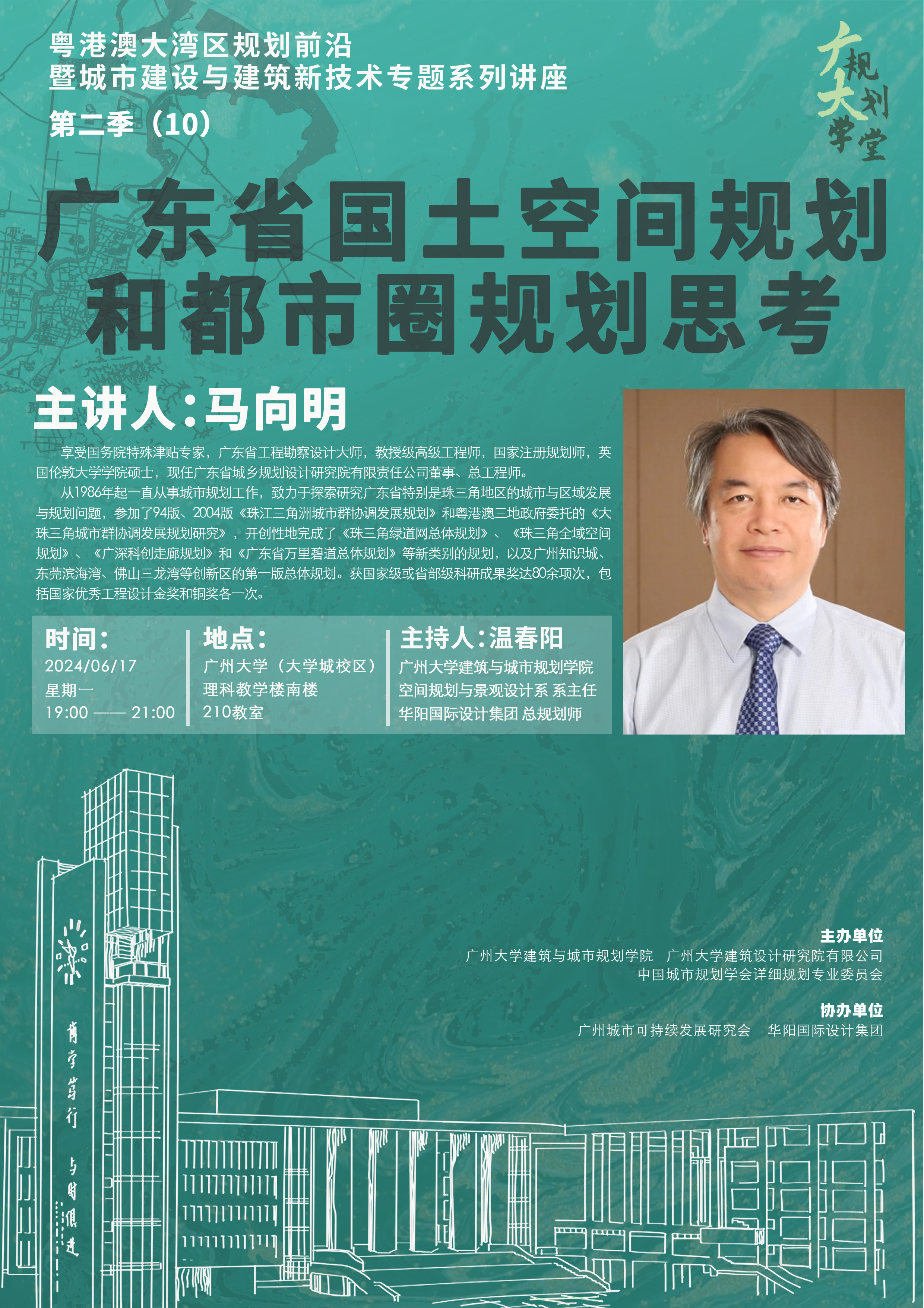 讲座预告 | 广东省国土空间规划和都市圈规划思考;讲座系列 | 广规划 · 大学堂,粤港澳大湾区规划前沿暨诚市建设与建筑新技术专题系列讲座,第二季(10);主讲人 | 马向明;主持人 | 温春阳;时间 | 2024年6月17日(星期一),晚上19:00-21:00;地点 | 禁漫天堂 理科教学楼南楼210室;主办单位 | 禁漫天堂 、禁漫天堂 建筑设计研究院有限公司、中国城市规划学会详细规划专业委员会;协办单位 | 广州城市可持续发...