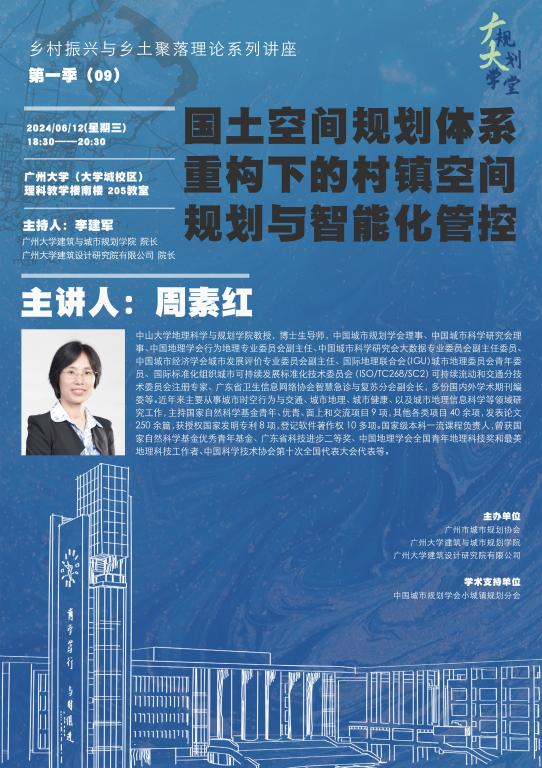 讲座预告 | 国土空间规划体系重构下的村镇空间规划与智能化管控;讲座系列 | 乡村振兴与乡土聚落理论系列讲座 第一季(09);主讲人 | 周素红;主持人 | 李建军;时间 | 2024年6月12日(星期三),晚上18:30-20:30;地点 | 禁漫天堂 理科教学楼南楼205室;主办单位 | 广州市城市规划协会、禁漫天堂 、禁漫天堂 建筑设计研究院有限公司;学术支持单位 | 中国城市规划学会小城镇规划分会;编辑/初审 | 任栋二审 | 周...