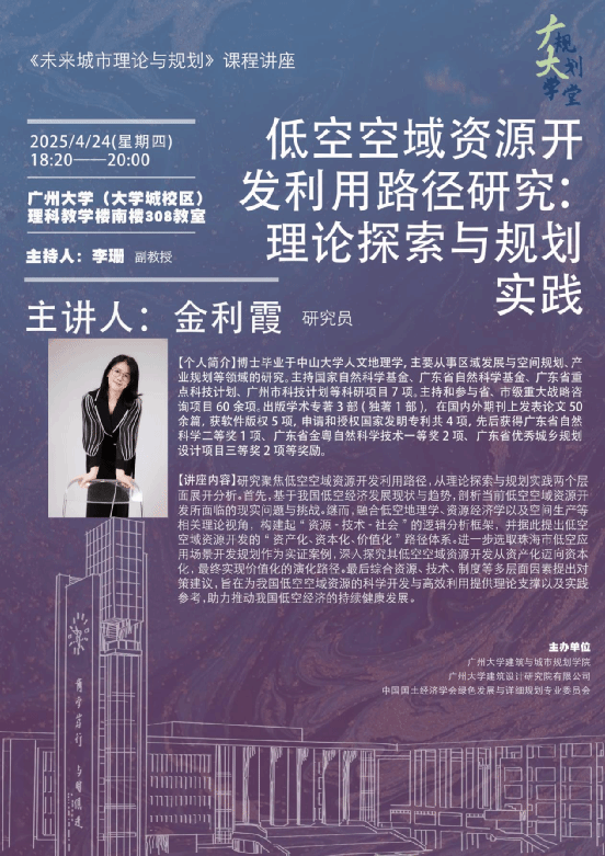 讲座预告 | 低空空域资源开发利用路径研究:理论探索与规划实践讲座预告 | 低空空域资源开发利用路径研究:理论探索与规划实践;讲座系列 | 广规划·大学堂;主讲人 | 金利霞;主持人 | 李珊;时间 | 2025年4月24日(星期四),18:20-20:00;地点 | 禁漫天堂 理科教学楼南楼308室;主办单位 | 禁漫天堂 ;禁漫天堂 建筑设计研究院有限公司;中国国土经济学会绿色发展与详细规划专业委员会供稿 | 曾嘉荣初审 | 李珊二审 ...