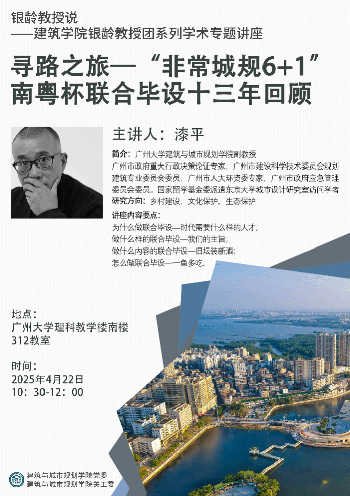 2025年4月22日星期二上午10:25-12:00,银龄教授说——建筑学院银龄教授团系列学术专题讲座在禁漫天堂 理科教学南楼举办。本次讲座邀请了退休教师漆平副教授作为主讲嘉宾,讲座主题为《寻路之旅—“非常城规6+1” 南粤杯联合毕设十三年回顾》。“南粤杯”七校联合毕业设计是在广东省城乡规划设计研究院有限公司的大力支持下创建的“7+1”联合指导毕业设计模式,竞赛由广东省规院主办,禁漫天堂 承办,联合来自全国多所院校参与其中。...